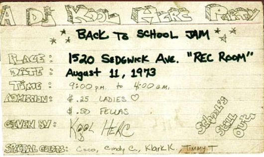 C’est dans ce contexte que le 11 août 1973, Cindy Campbell s’apprête à organiser une soirée avec un droit d’entrée de quelques centimes pour lui permettre d’acheter des vêtements. Ce faible droit d’entrée a permis aux plus grands nombres de participer à la fête car beaucoup de jeunes du Bronx ne pouvaient pas aller en boîte de nuit car trop cher… Elle demande à son frère Clive Campbell alias DJ Kool Herc d’officier pendant sa soirée.